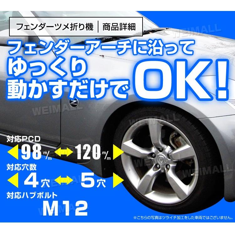 オンライン通販のAmazon公式サイトなら、フェンダーベンディングツール つめ折り機 爪折り機 ツメ折り ツライチ オーバーフェンダー 4穴 5穴対応を車&バイクストアで、いつでもお安く。当日お急ぎ便対象商品は、当日お届け可能です。アマゾン配送商品は、通常送料無料。フェンダーツメ折り いわゆるツメ(ミミとも言う)折りになりますが「ペタッ」と折らずにゆるくカーブした作りで塗装を割らずに加工します。 作業工賃:リア左右 48,000円~